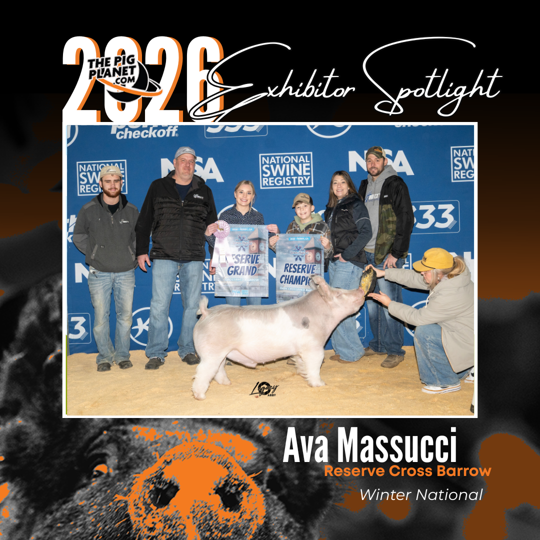 I showed my crossbred barrow, Vector, at Winter National. We also won our youth expo, PAYLE. He is bred by Will Hilty, sired by Mainline, and backed on an Absolute × Cruel Intentions sow.