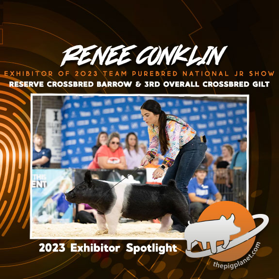 We Caught up with Ms. Renee Conklin exhibitor of the Reserve Overall Crossbred Barrow and the 3rd Overall Crossbred Gilt at The 2023 Team Purebred National Jr Show. Learn more about Renee below…